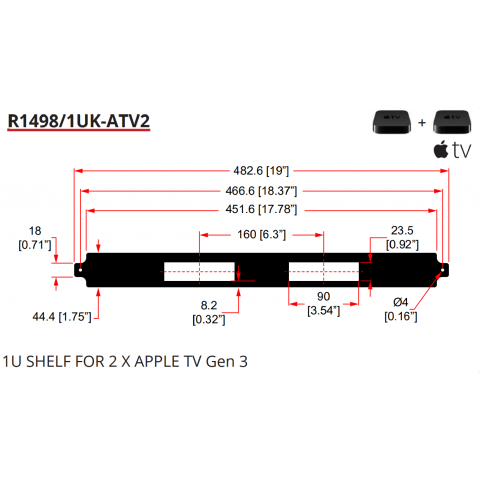 1U Vented Rack Shelf & Magnetic Faceplate For 2 x Apple TV